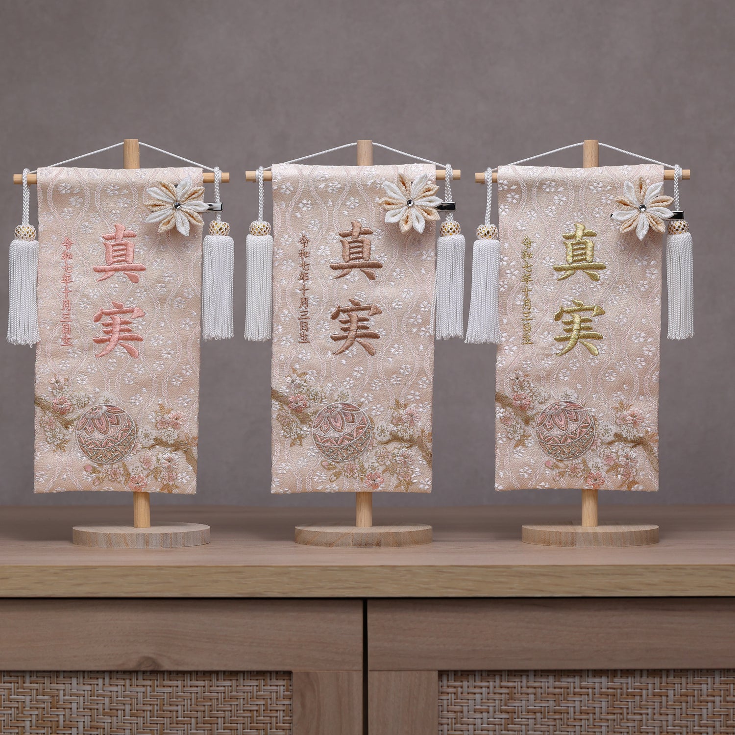 【フラワーアート×LEDライト】くすみカラー×手刺繍風 麻柄刺繍 ひな飾りセット