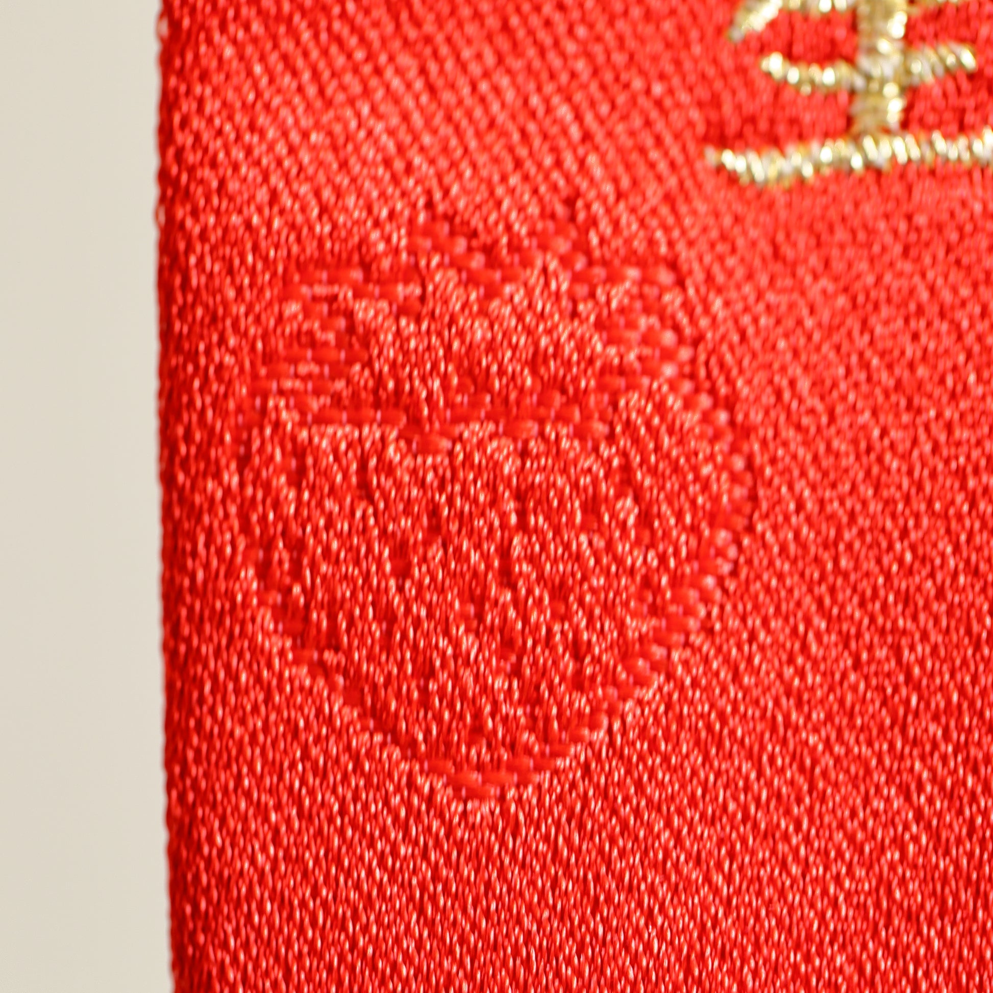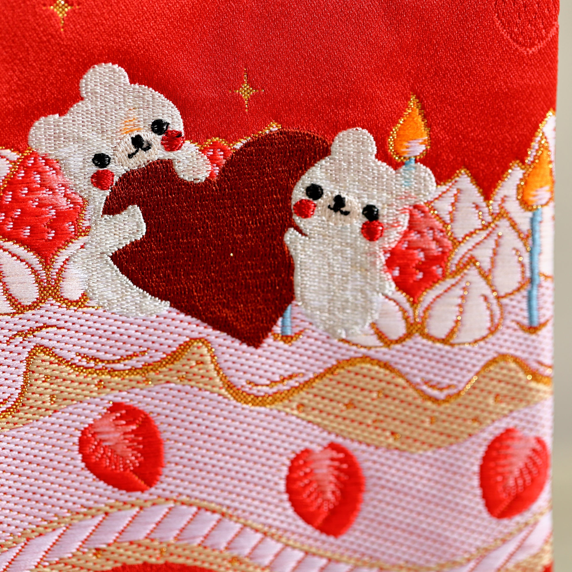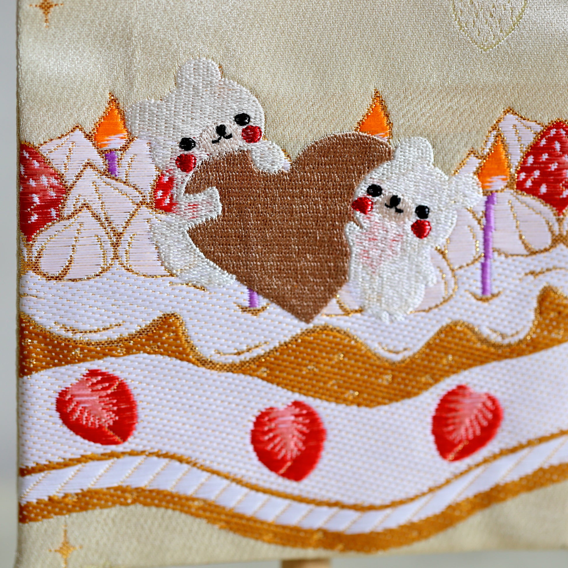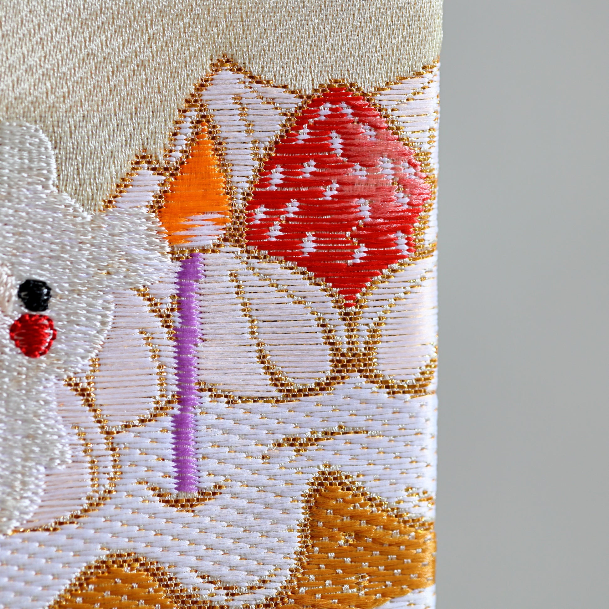 金襴の地模様には、可愛いイチゴの柄が織り込まれており