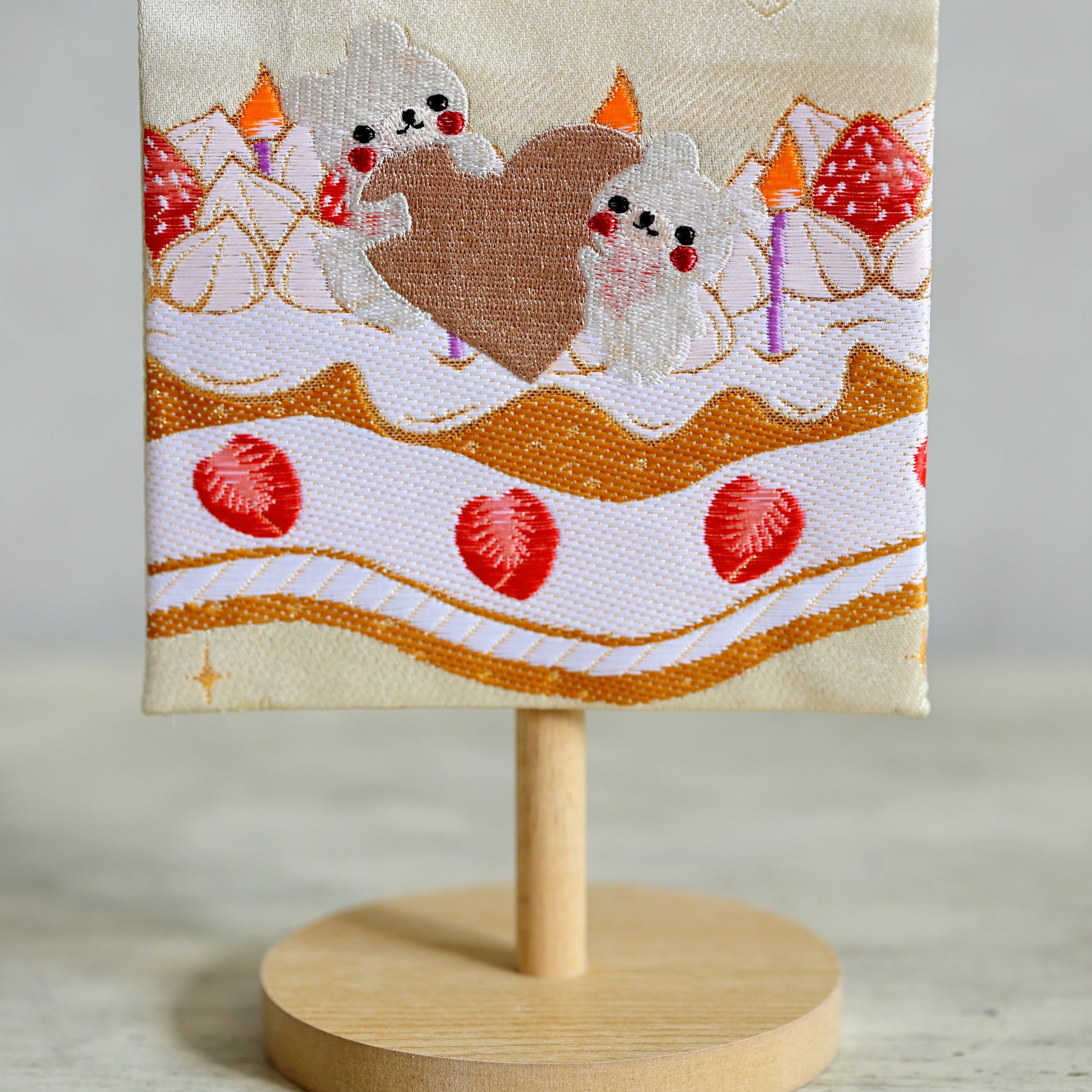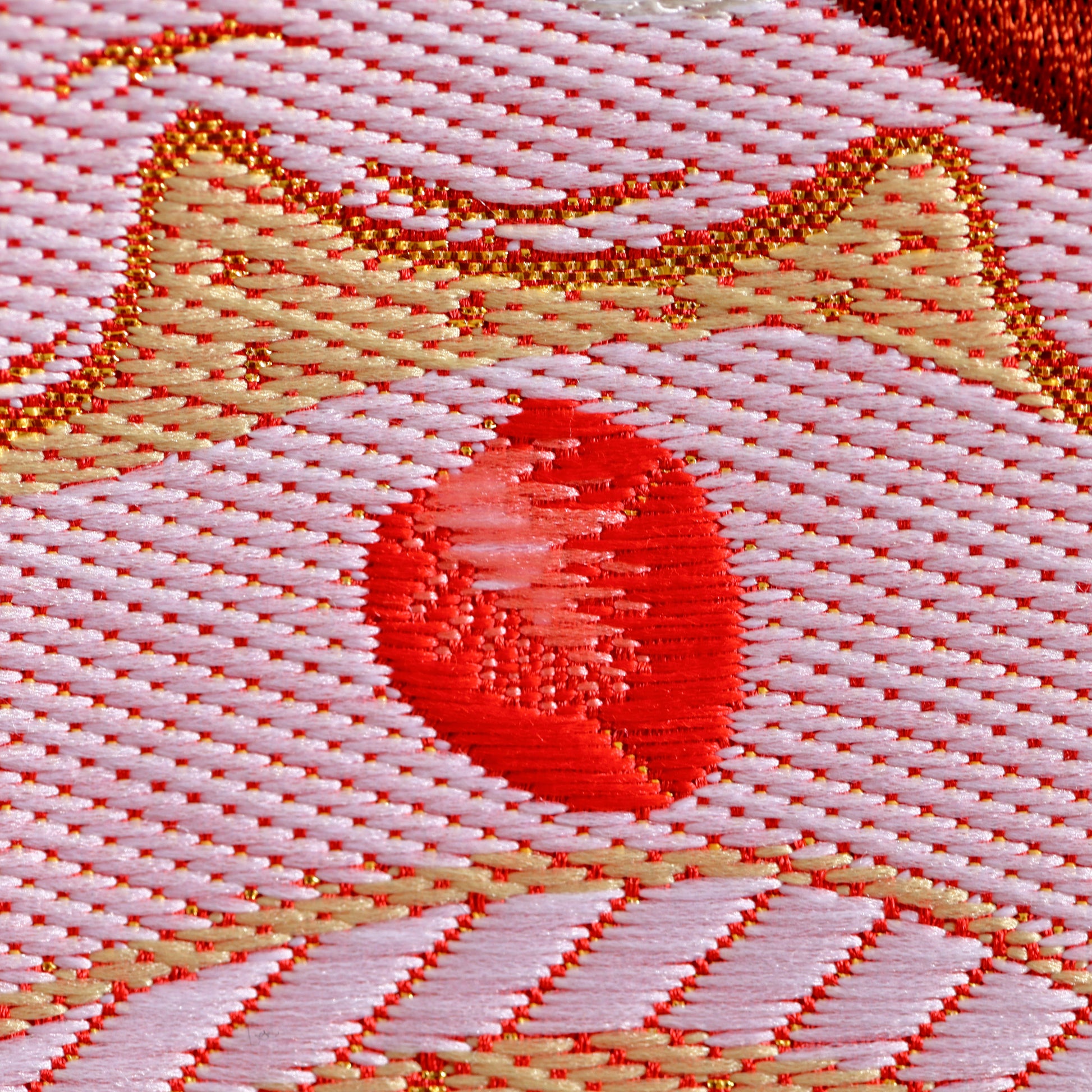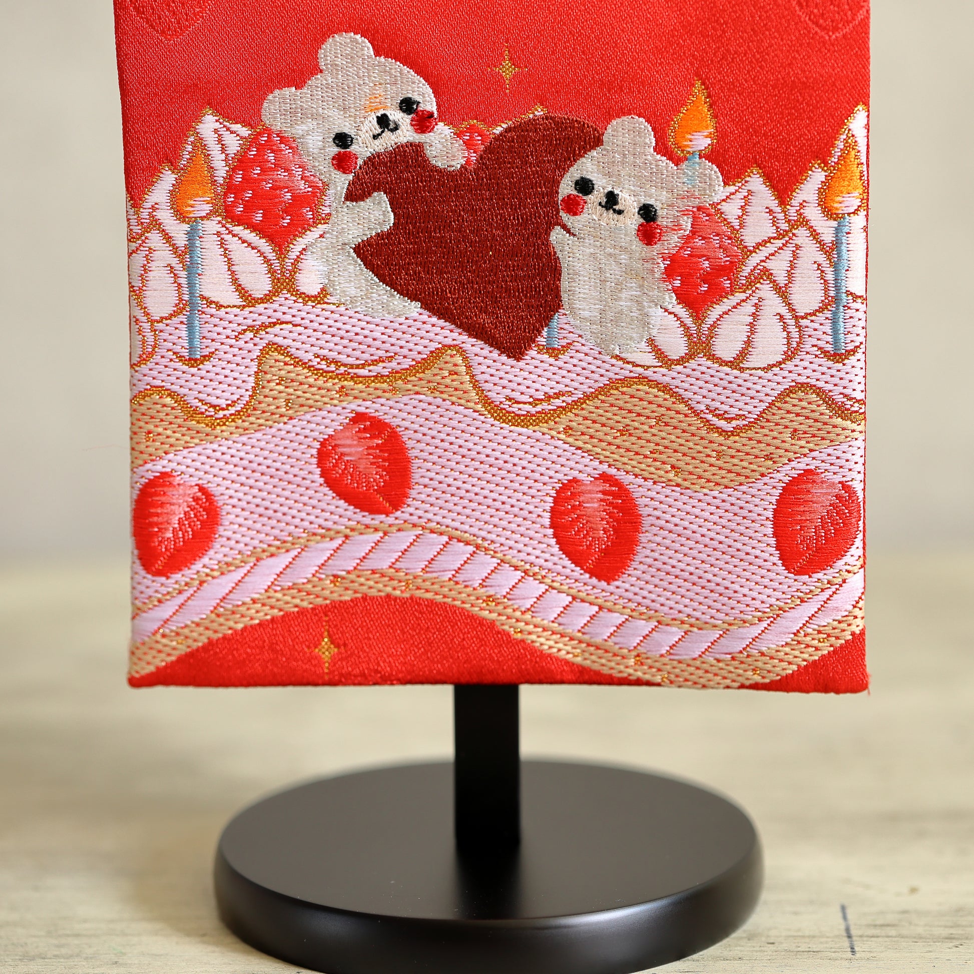 金襴の地模様には、可愛いイチゴの柄が織り込まれており