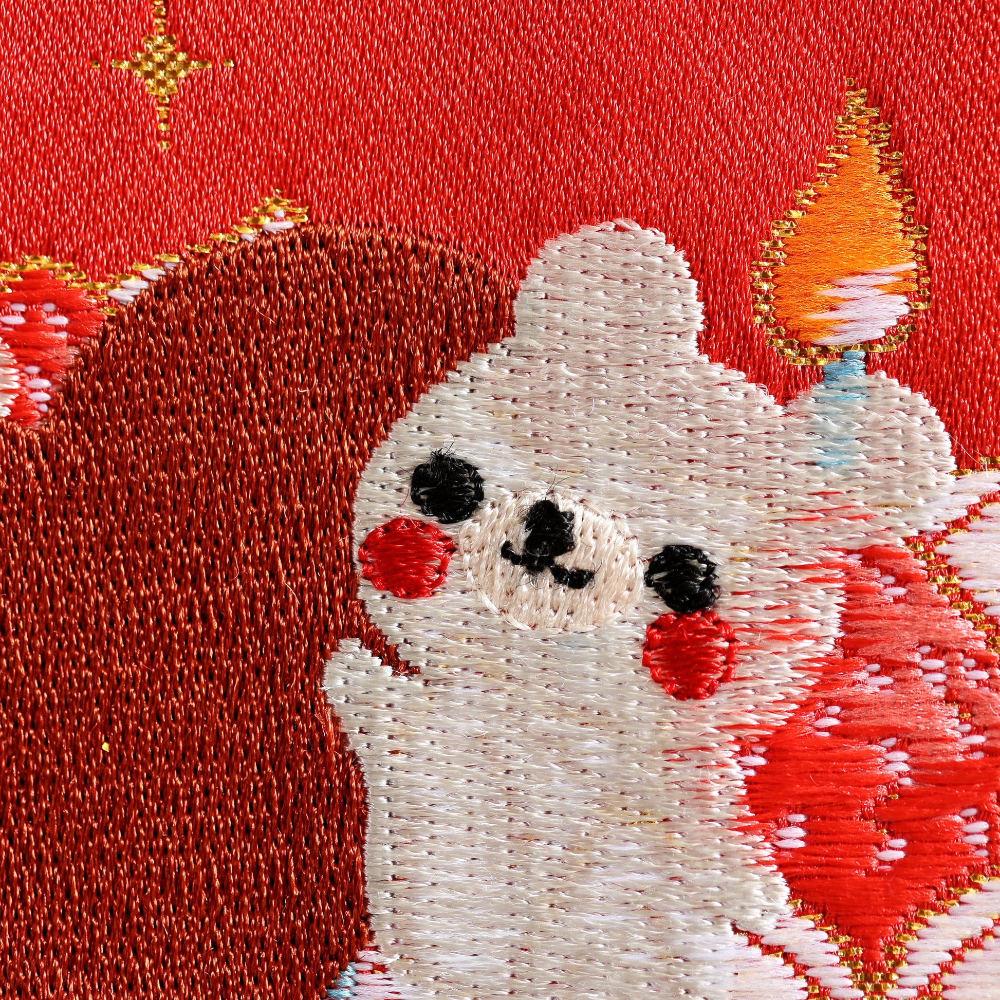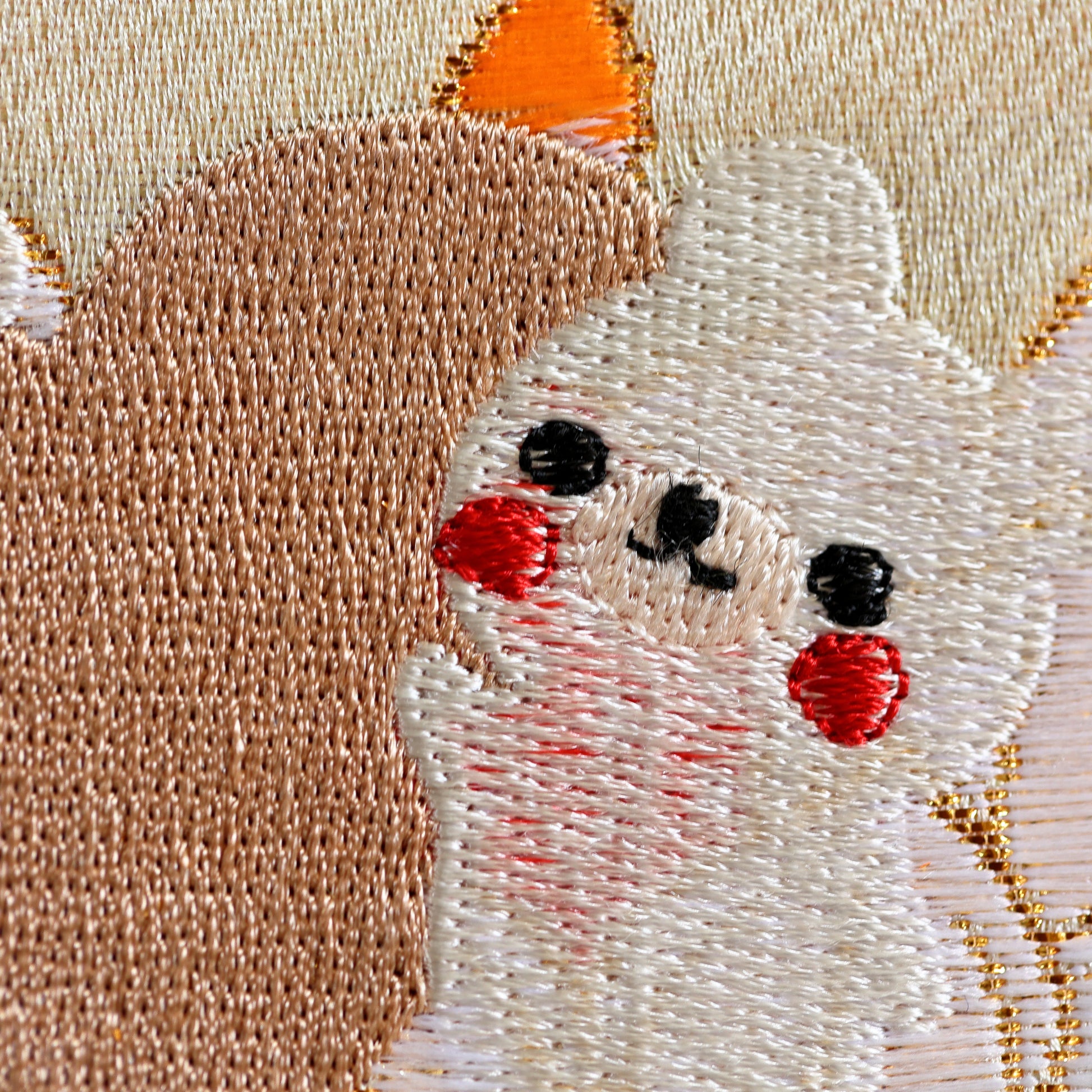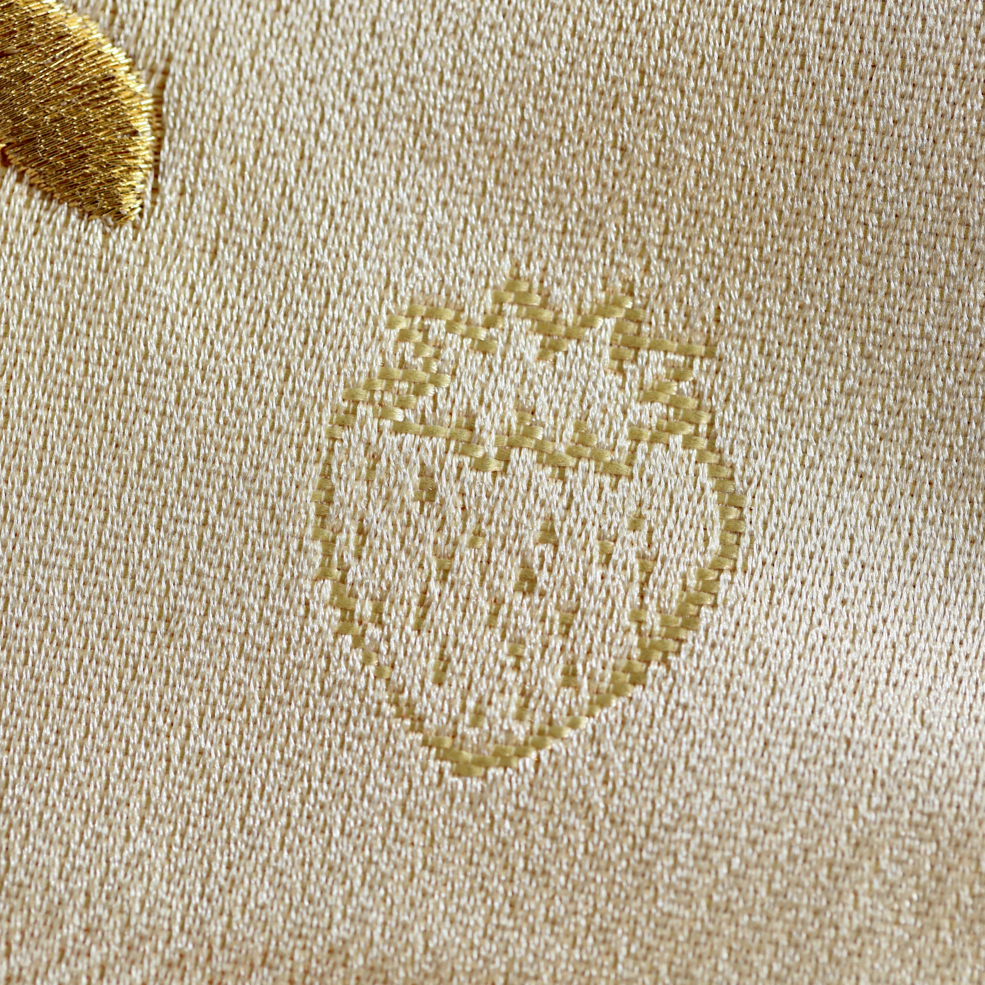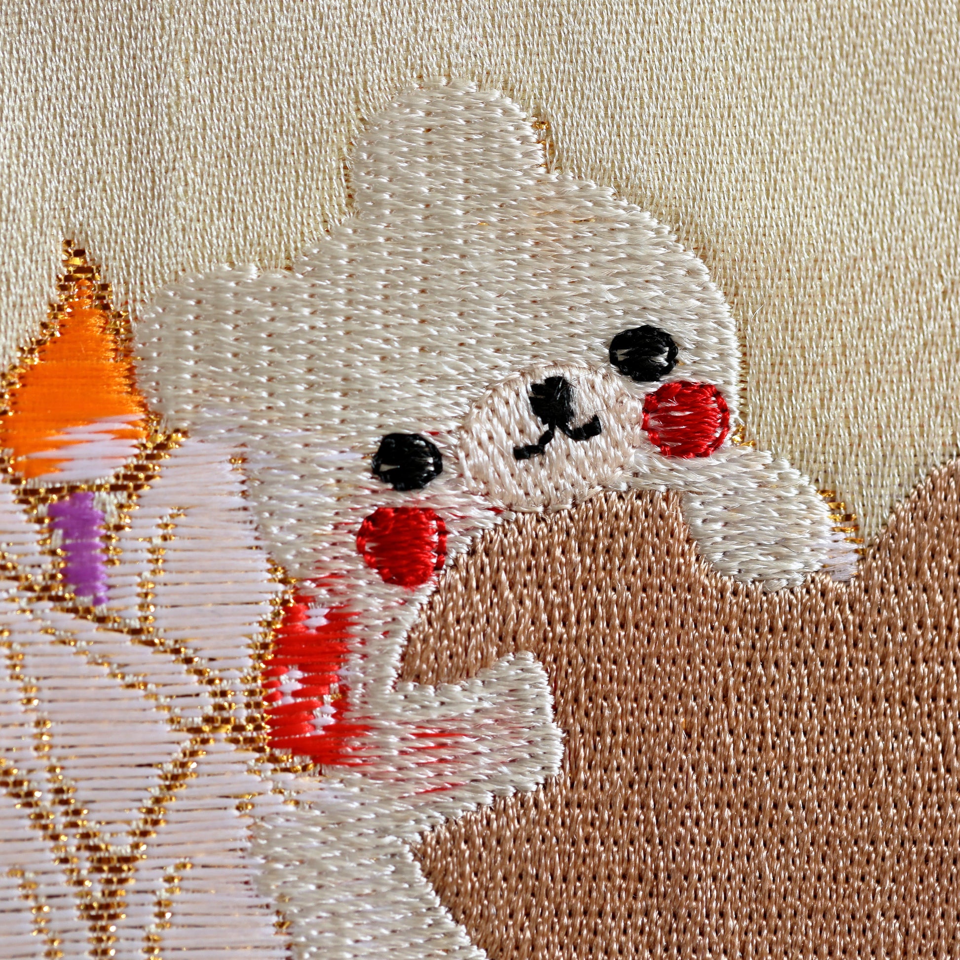 金襴の地模様には、可愛いイチゴの柄が織り込まれており