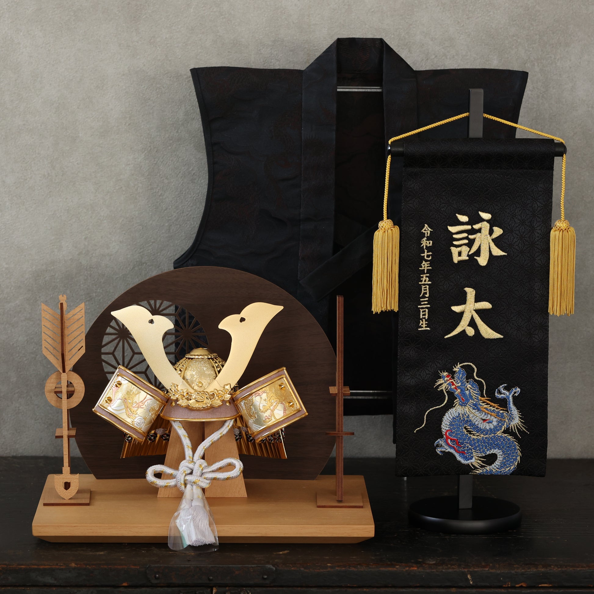 力強い龍の彫金が目を引く兜は、お子様の未来を照らす希望の象徴。陣羽織には、龍の地紋をあしらい、伝統的な美しさと現代的なデザインを融合させました。屏風は、落ち着いたダークブラウンと温かみのあるナチュラルの2色からお選びいただけ、お部屋の雰囲気に合わせて飾っていただけます。