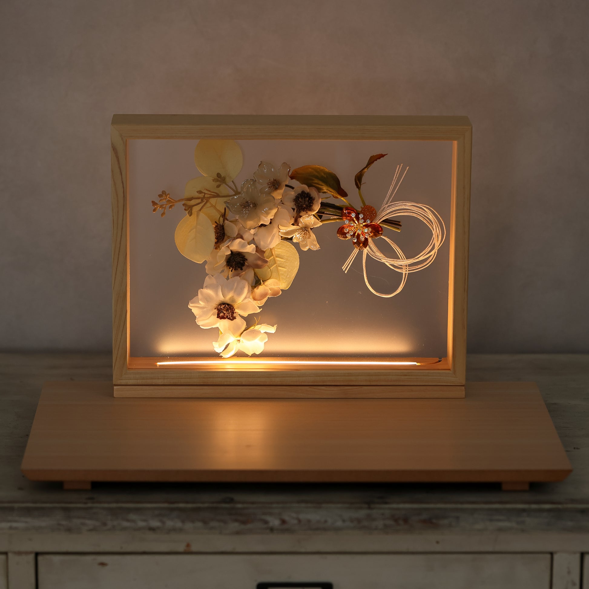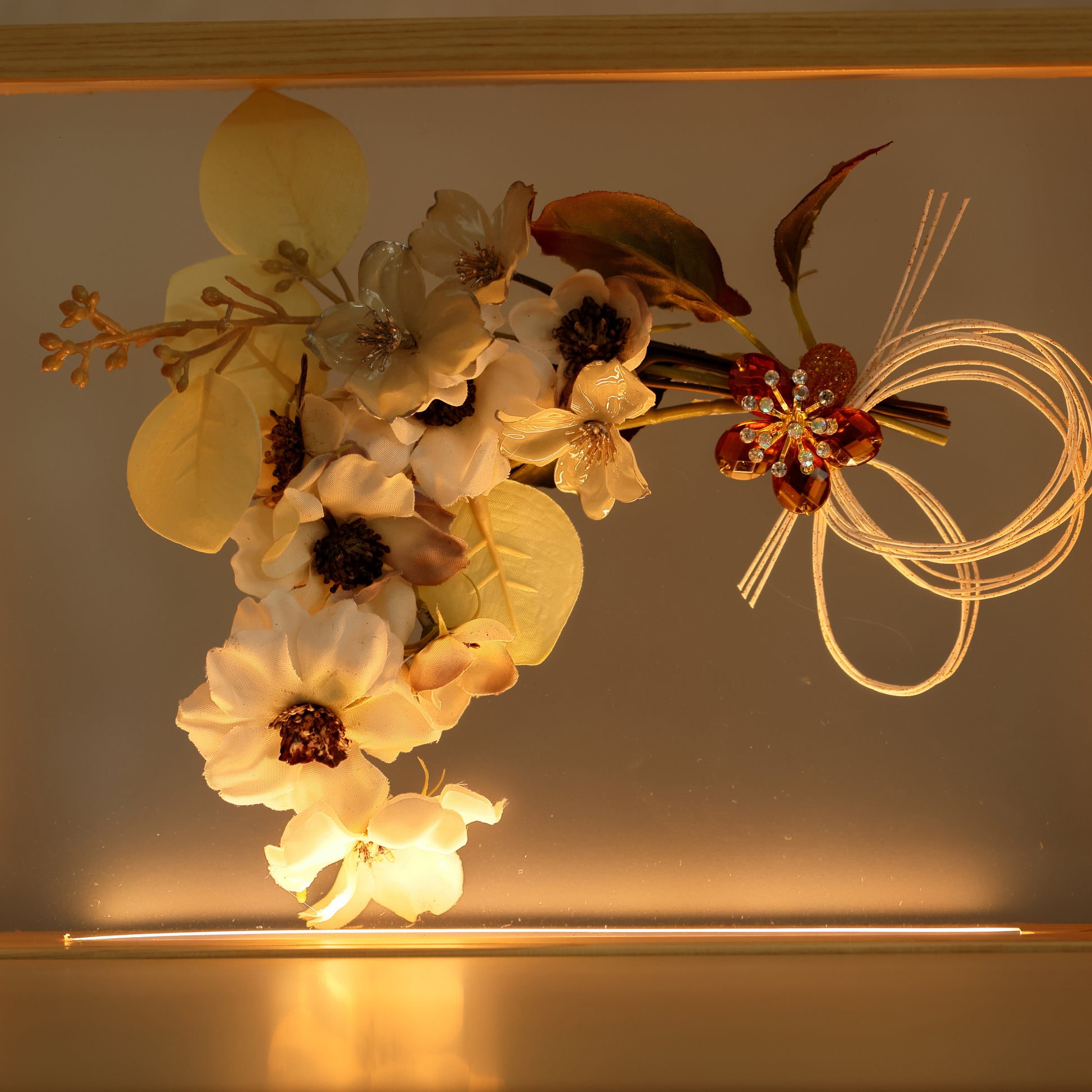 背景には淡い花々のフラワーアートとLEDライトを組み合わせ、