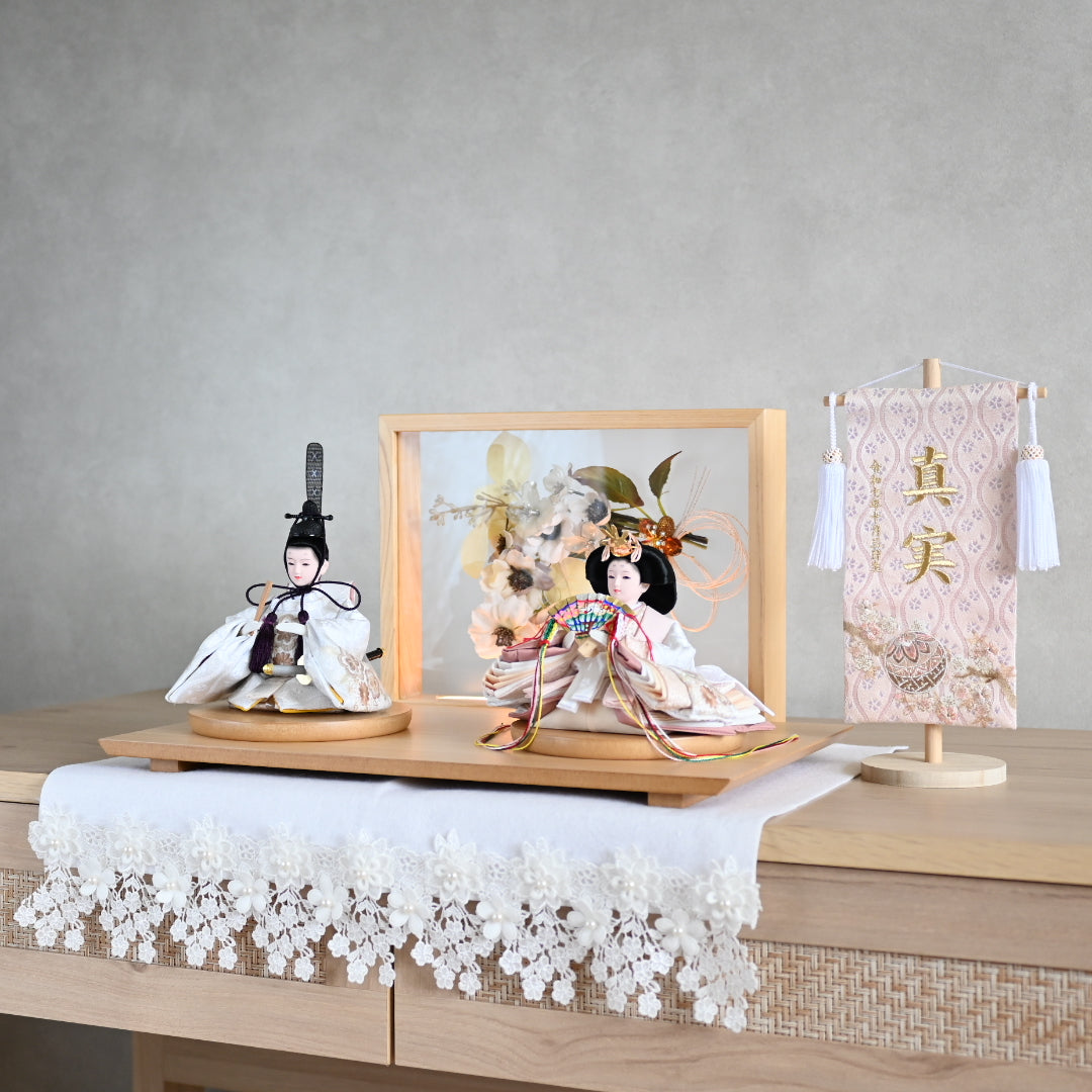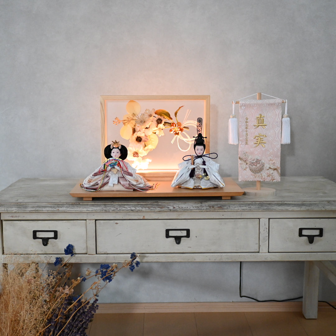 【フラワーアート×LEDライト】くすみカラー×手刺繍風 麻柄刺繍 ひな飾りセット