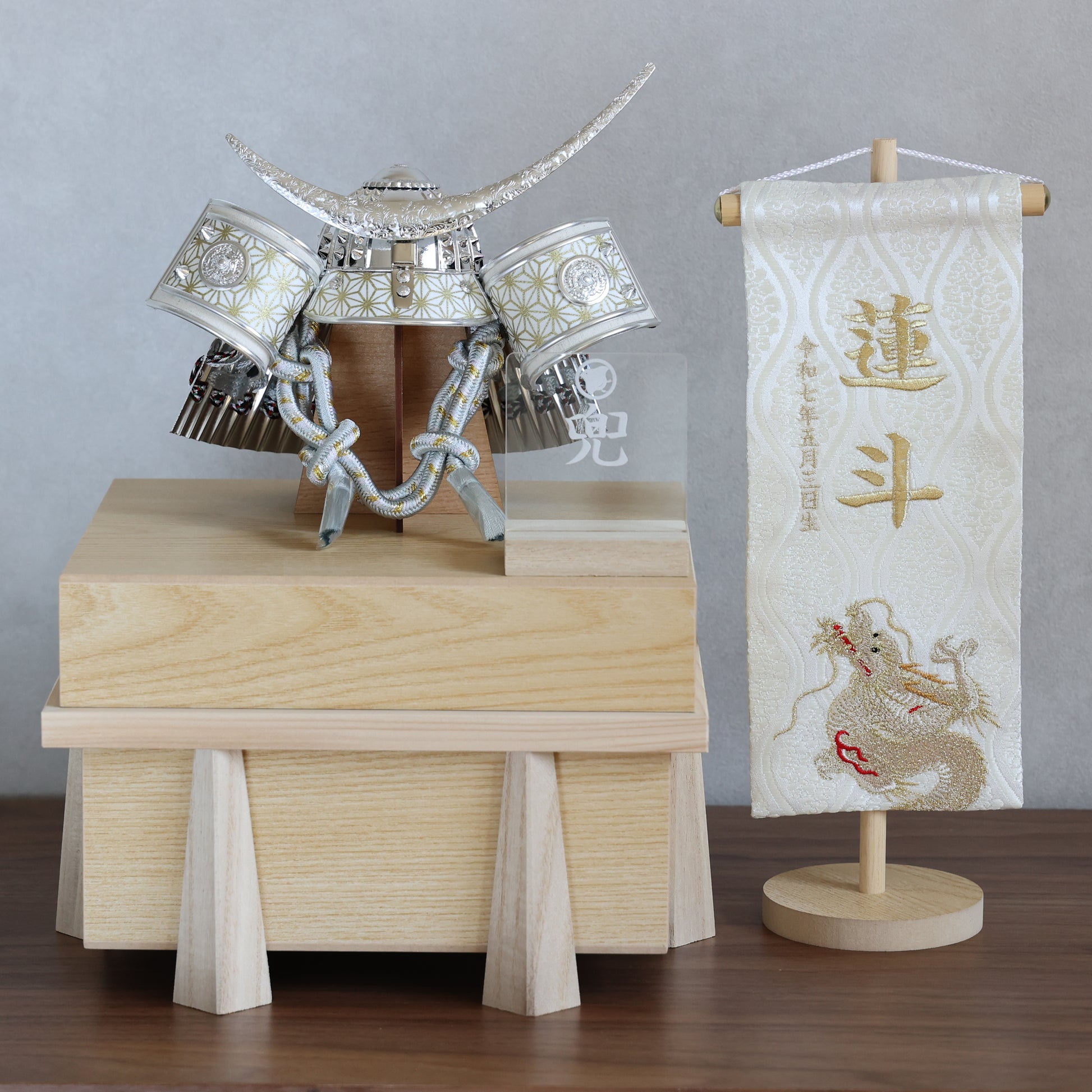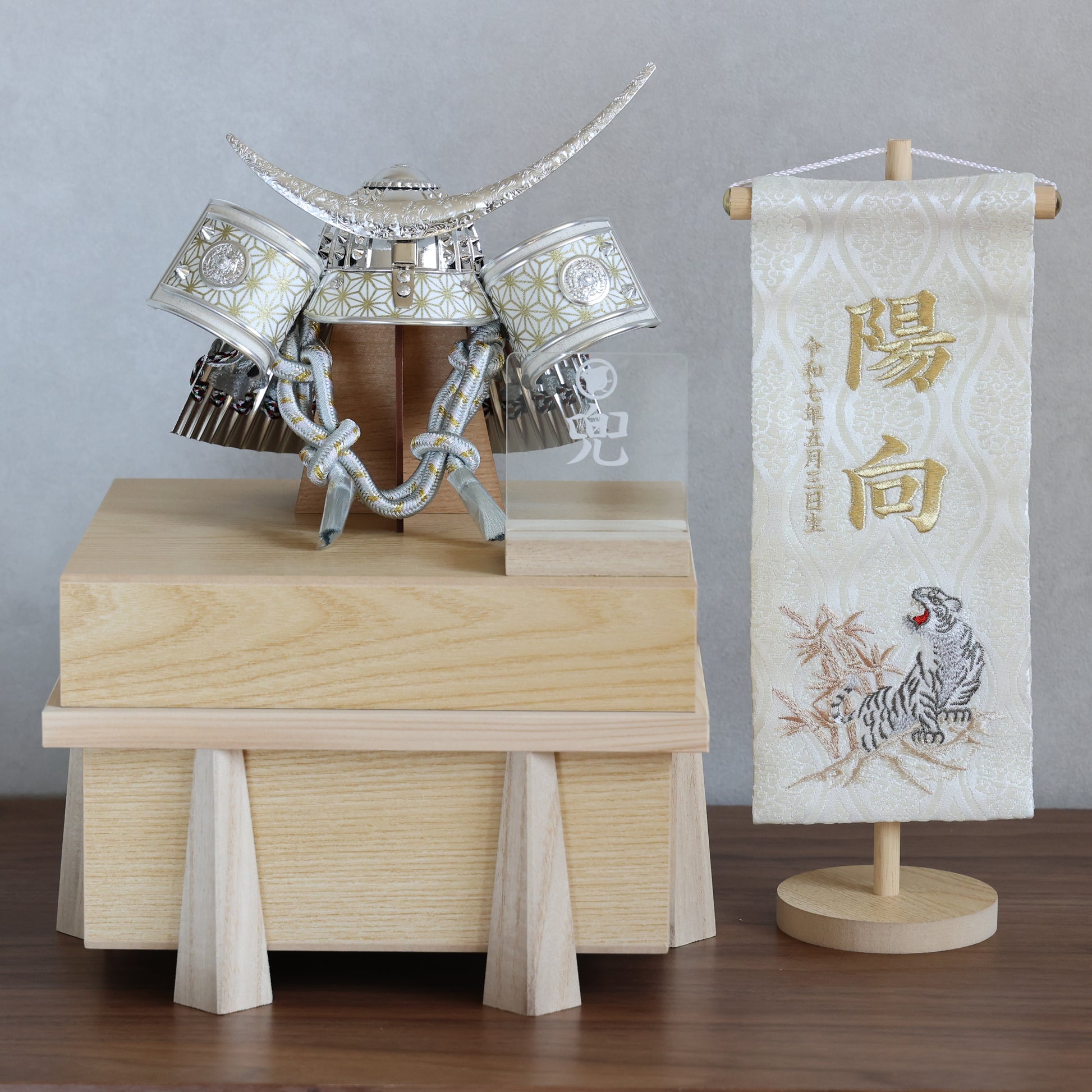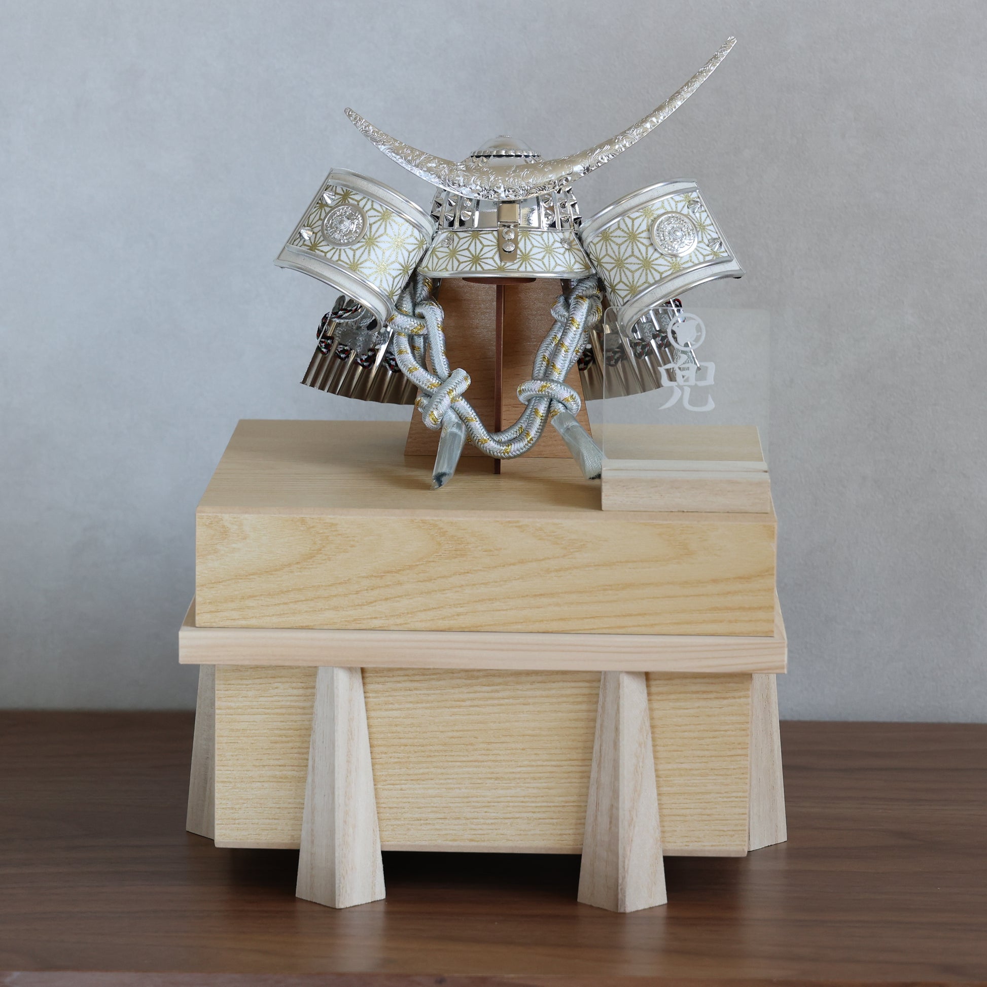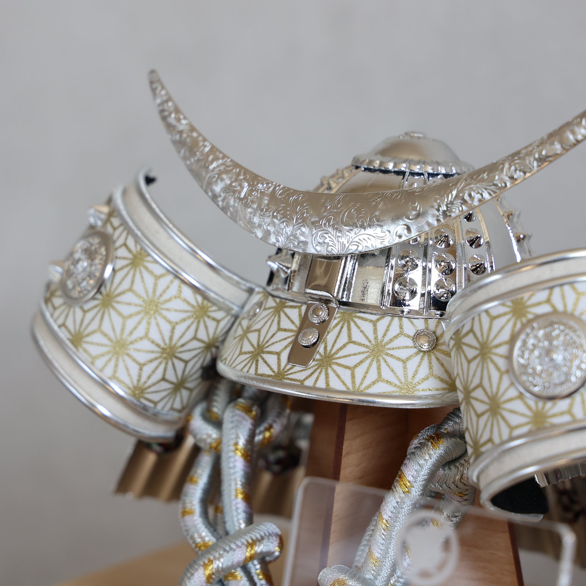 麻柄でのデザインが施された兜が主役。シンプルながらも圧倒的な存在感を誇り、見る人を魅了します。
