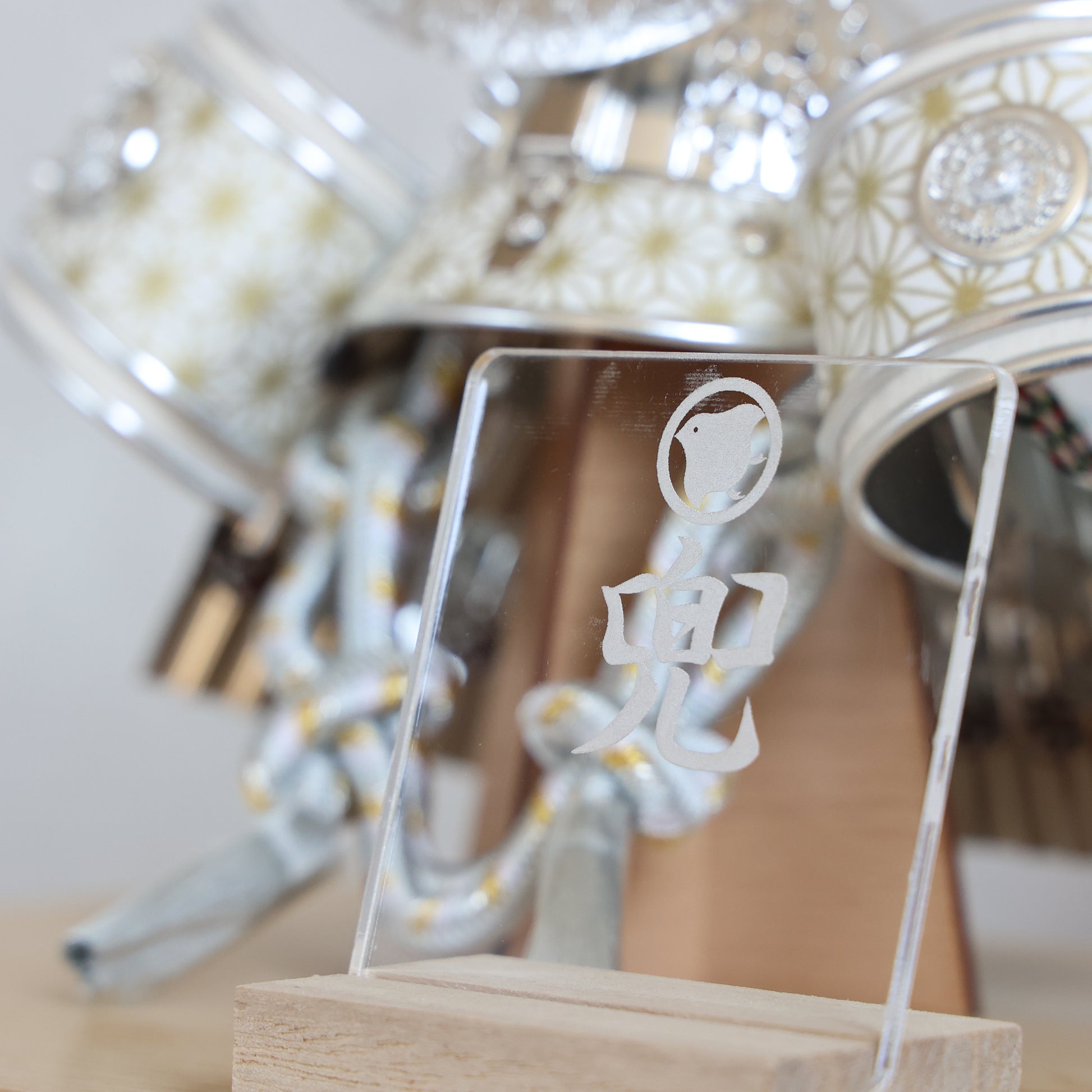 セットには、上品なデザインのお櫃(横23.5cm、高さ16cm、奥行21cm)、兜を立てるためのスタンド、そしてアクリル立札が含まれています。